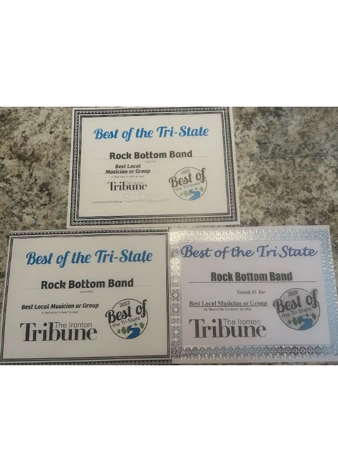 In 2022, 2023, and 2024, Rock Bottom Band received awards from the Ironton Ohio Tribune for being voted for Best of the Tri-State.